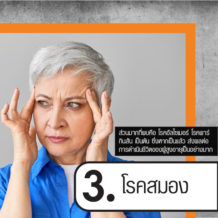 ส่วนมากที่พบคือ โรคอัลไซเมอร์ โรคพาร์กินสัน เป็นต้น ซึ่งหากเป็นแล้ว ส่งผลต่อการดำเนินชีวิตของผู้สูงอายุเป็นอย่างมาก การดูแลและป้องกันตนเองจากโรคทางสมองแต่เนิ่นๆ คือการฝึกใช้สมองทุกวัน ฝึกความจำในรูปแบบต่างๆ ทั้งการอ่าน การท่อง การจดบันทึก รวมไปถึงการเล่นเกมฝึกสมองทั้งหลาย