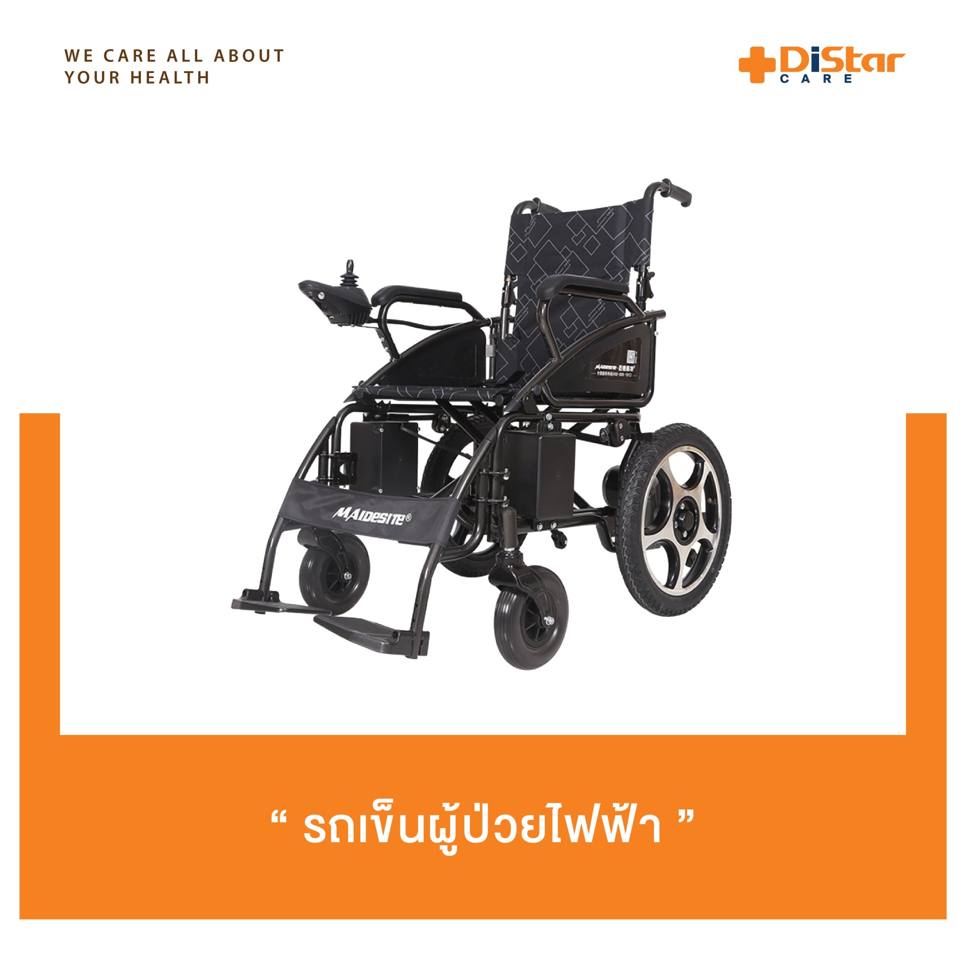 2. รถเข็นไฟฟ้า ทำงานโดยเครื่องยนต์และต้องใช้แบตเตอรี่ เหมาะสำหรับผู้ที่มีกล้ามเนื้อลำตัวส่วนบนไม่ค่อยแข็งแรง และมีราคาแพงกว่าวีลแชร์ชนิดออกแรง