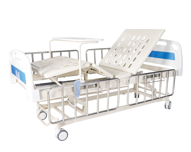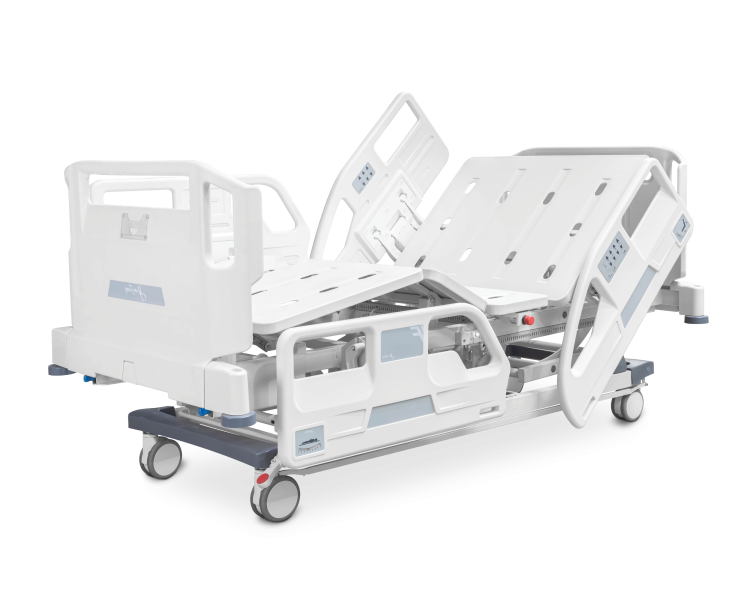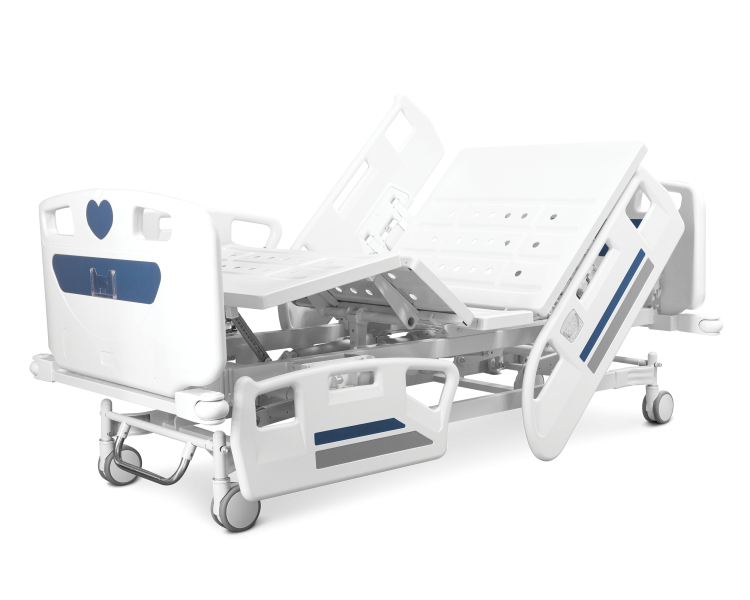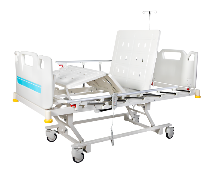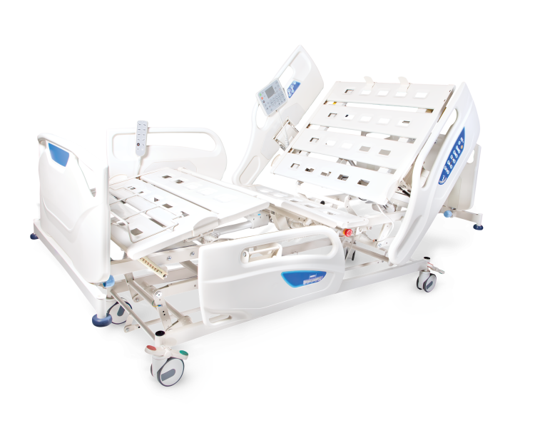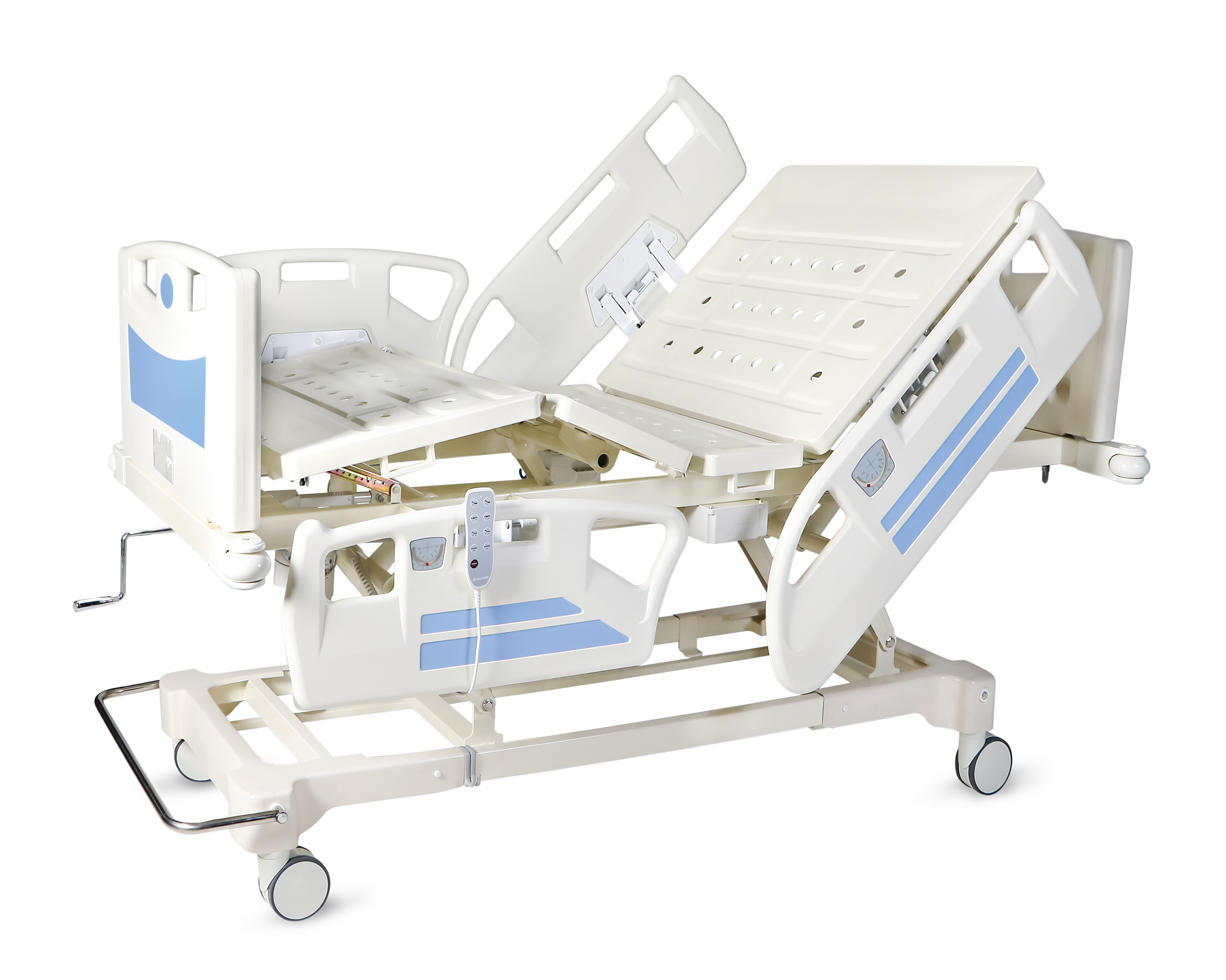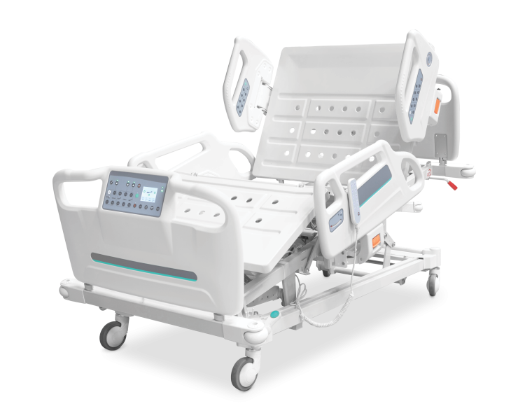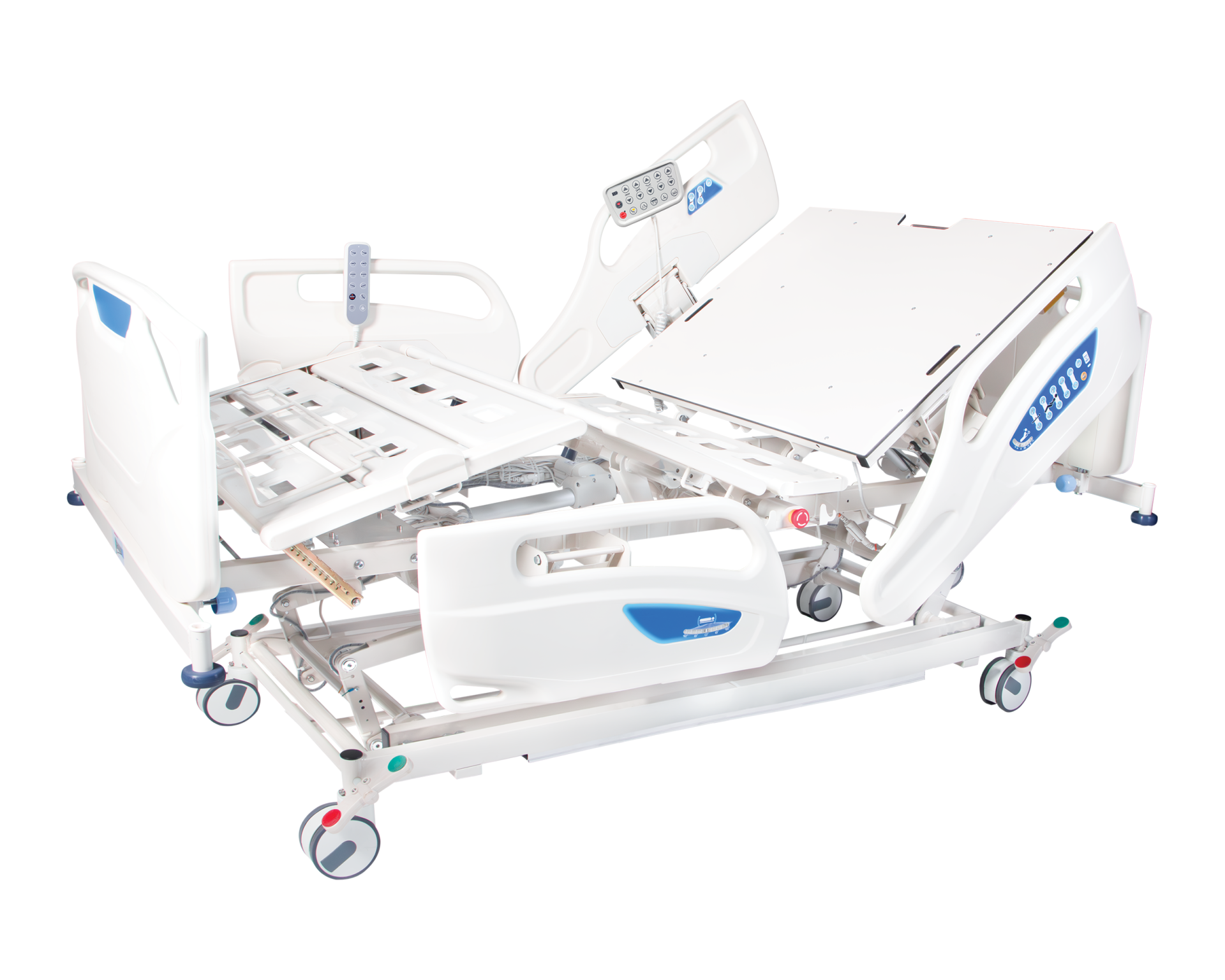 Multi-Function Electric Hospital Bed with Backup Battery Designed for critically ill patients, this bed features fully electric position adjustments for optimal patient care. It is equipped with both a handheld remote control and an integrated control panel, supports built-in patient weighing, and is compatible with X-ray procedures.