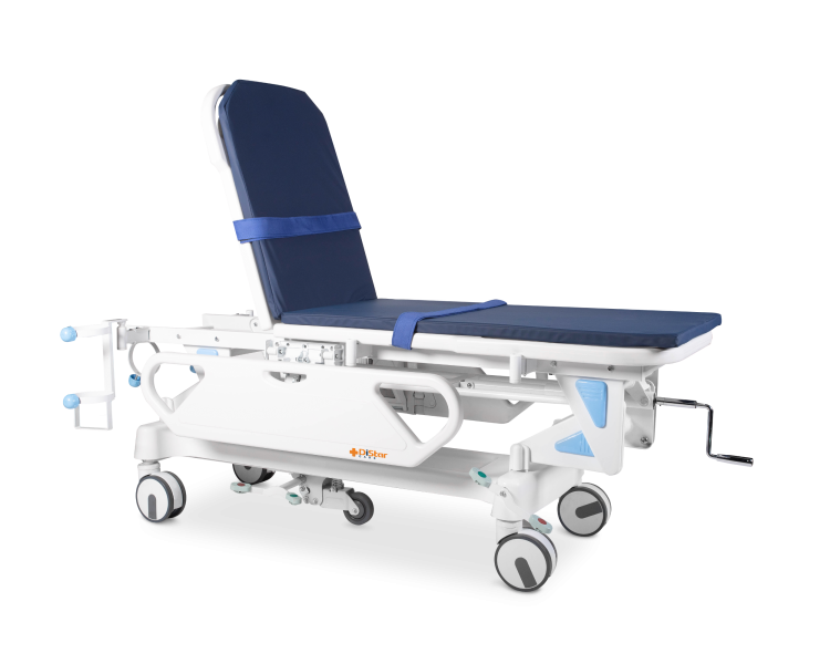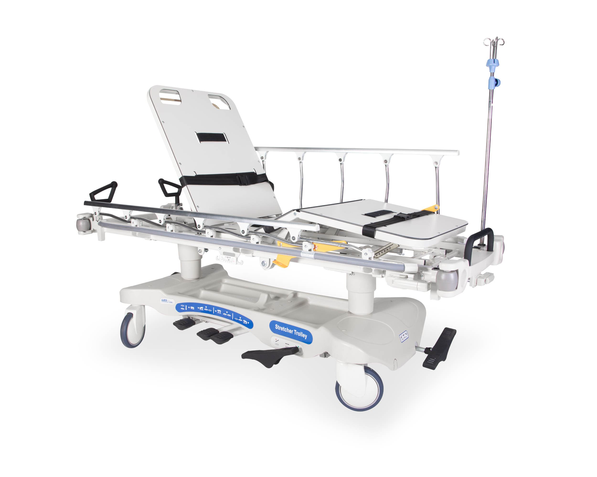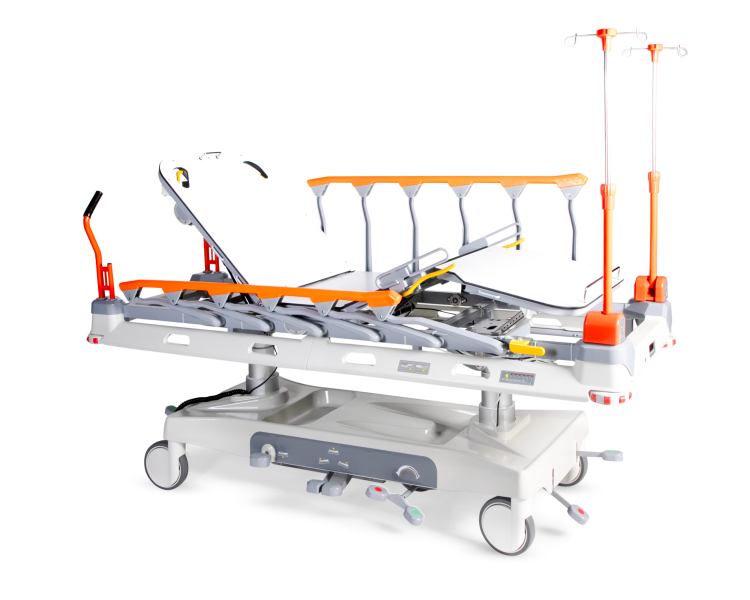 Hydraulic stretcher trolley model SC-2 can X-ray through with a compartment for inserting X-ray discs (Casset x-Ray) adjustable by hydraulic system Quick and easy to adjust the level, can adjust the back, high, low, high head, low feet, low feet, high head There are brake pedals on all 4 sides of the bed, the IV column and handles are foldable.