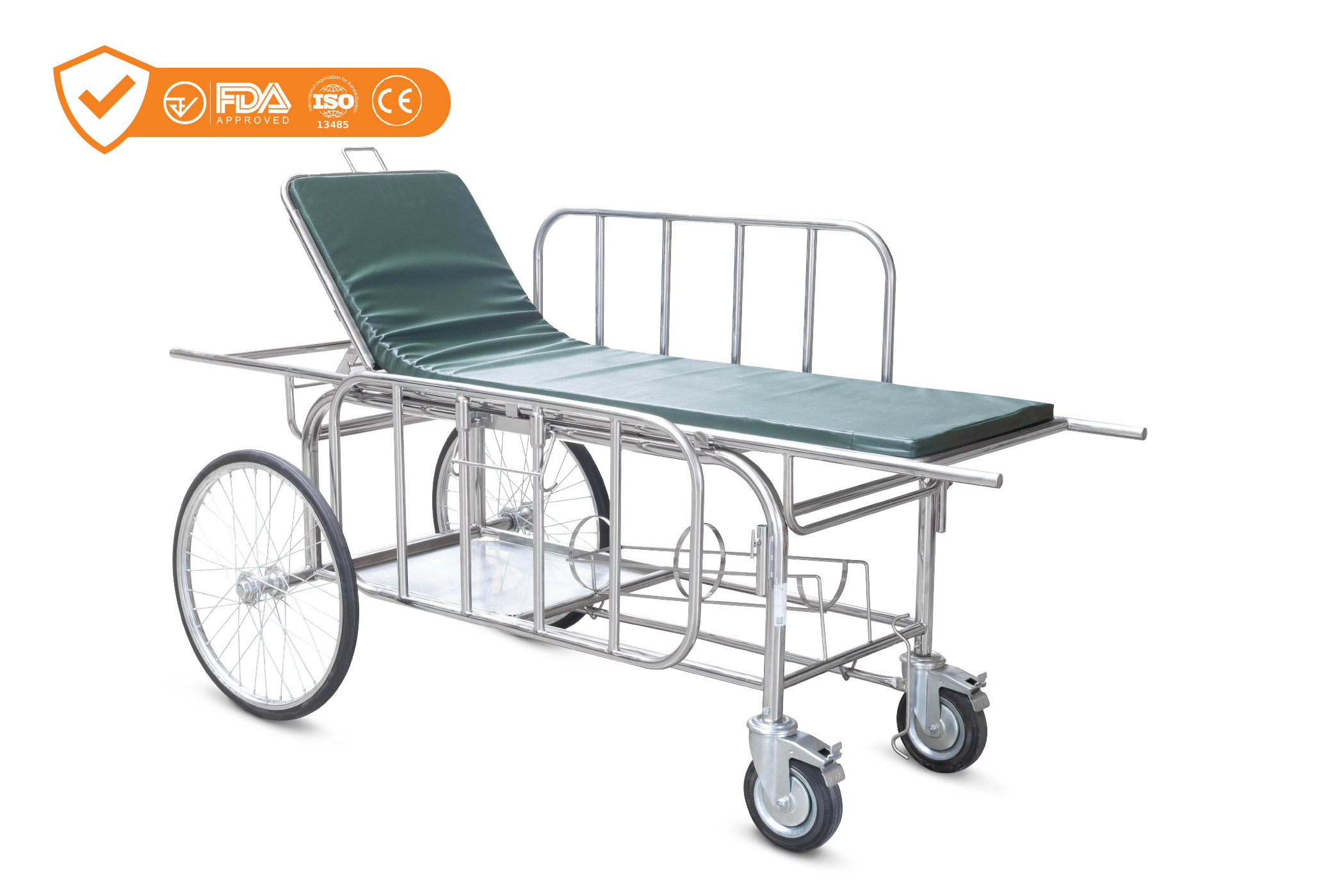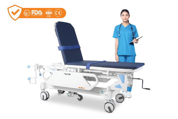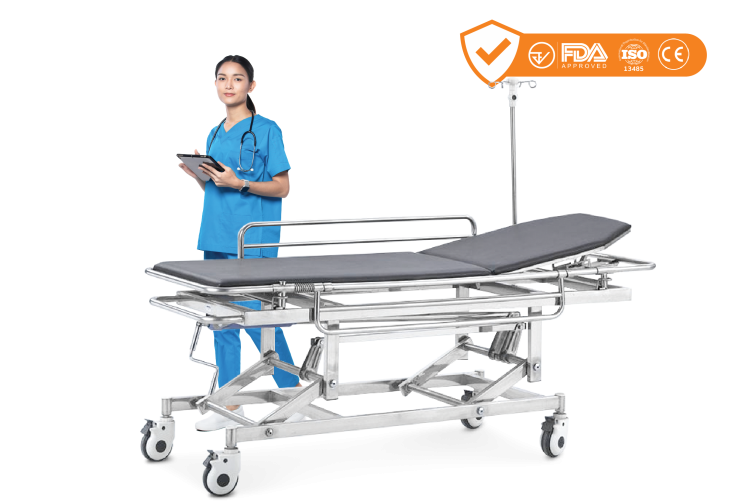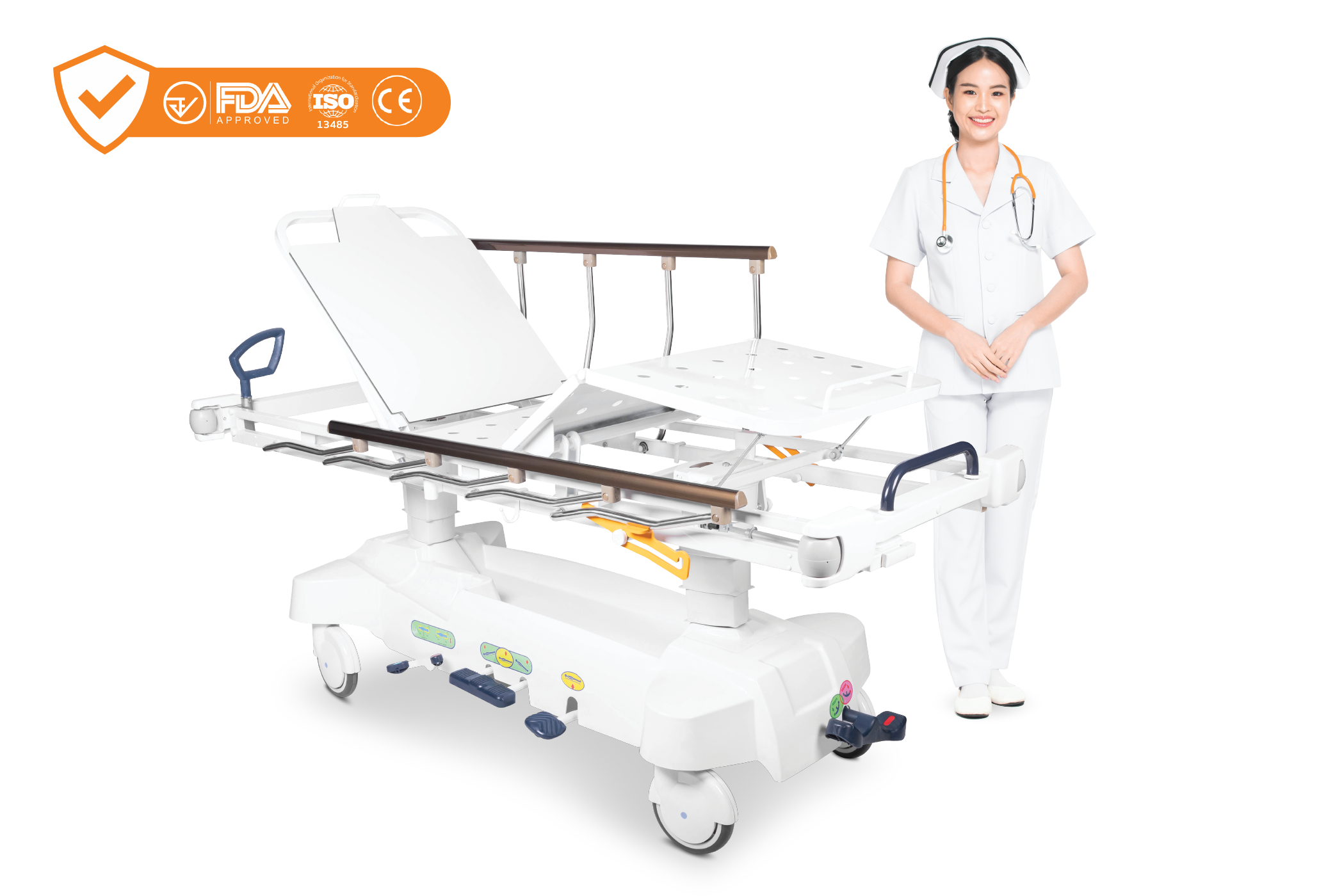 รถเข็นเปลนอนแบบ ไฮดรอริค สามารถ X-ray ผ่านได้พร้อมช่องสำหรับใส่แผ่น X-ray ( Casset x-Ray ) ปรับระดับด้วยระบบไฮดรอริค สดวกรวดเร็วในการปรับระดัับ สามารถปรับ ส่วนหลัง,สูงต่ำ,หัวสูงเท้าต่ำ,เท้าต่ำหัวสูง มีแป่นเหยียบเบรกทั้ง 4 ด้านของเตียง เสาน้ำเกลือและมือจับสามารถพับเก็บได้